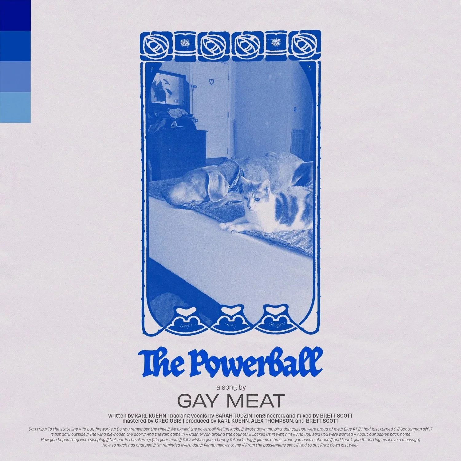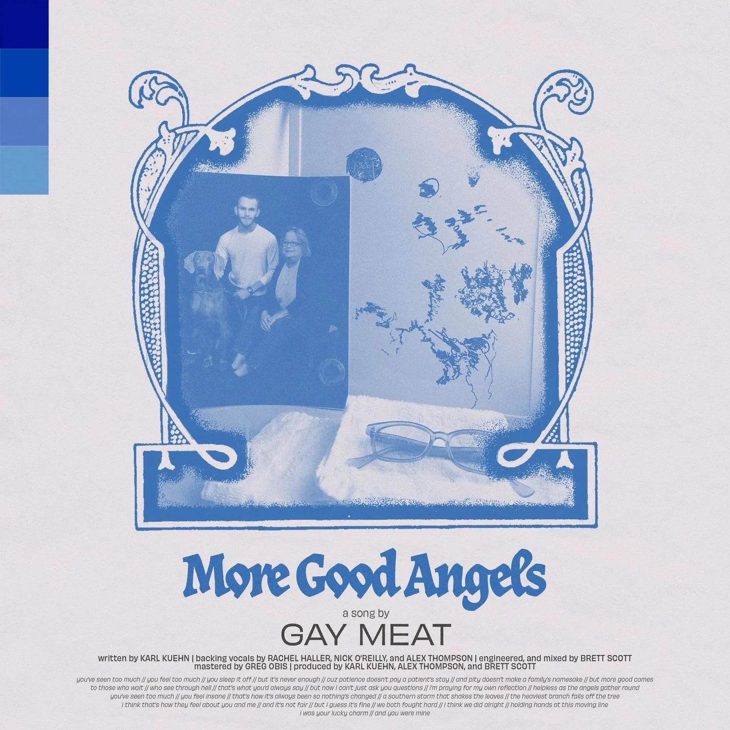 The doctors gave Karen a week to a year, but it wasn’t until January 2021 that she passed away, a gift of time that gave Kuehn a chance to get to know the person behind the parent. Those three years, marred by a roof-ripping hurricane, a pandemic and a life turned upside down, Kuehn found solace in the only way he knew how; he picked up any instrument within reach and began to piece together their story. Blue Water is the first album under his new moniker Gay Meat, and lovingly, gently says goodbye to a mom, piecing together the sepia patchwork of memories through a child’s eyes and asks which direction to walk without the foundation of family, no matter how small it was in the first place.